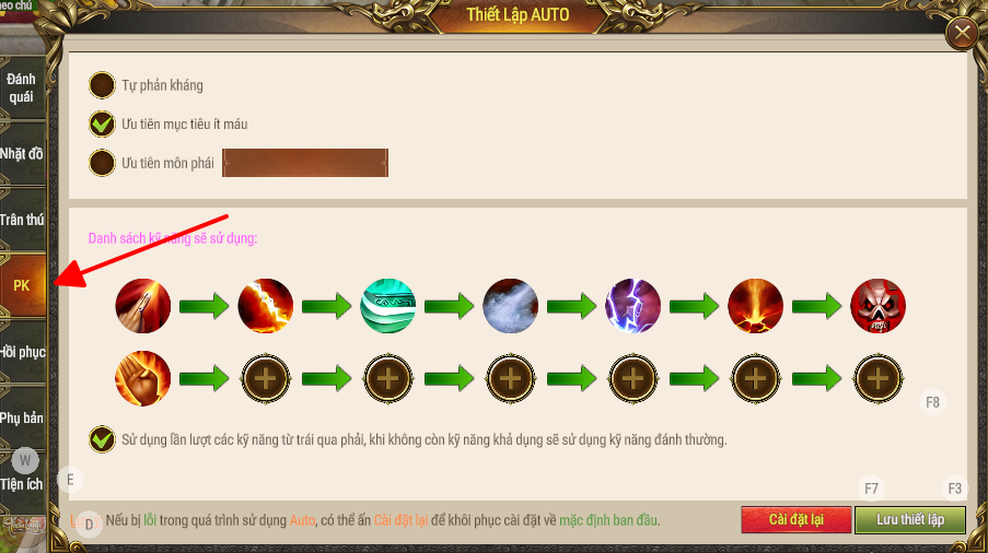 Auto pk quý bằng hữu cài skill tương tự như auto đánh quái khi bị pk sẽ lập tức đánh trả lại đối phương theo thứ tự kỹ năng bằng hữu cài đặt (mục Đánh Theo Combo).