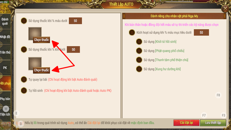 hồi phục theo % mong muốn và tự động sử dụng skill hồi phục đối với phái