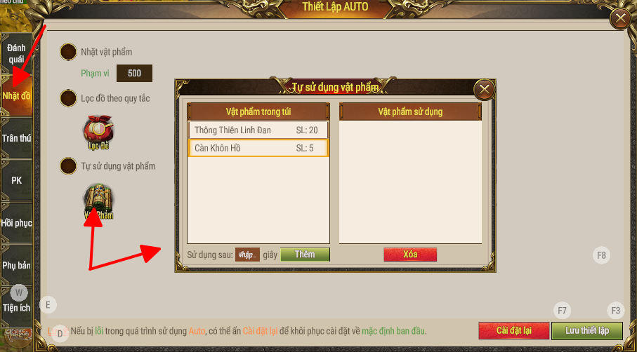 Tự sử dụng vật phẩm là nhân vật sẽ tự động sử dụng vật phẩm đã đc chọn trong thời gian tính bằng giây, nếu quá số lượng lưu trữ vui lòng chọn reset auto và tiến hành cài đặt lại sau khi đăng nhập lại để hệ thống cập nhật dữ liệu nhân vật mới nhất.