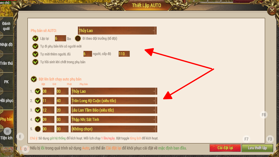 Tại mục này quý bằng hữu sẽ có thể cài đặt số lượt lặp lại đi phụ bản có thể chọn từ 1-6 lần, chọn đi theo đội trưởng (tổ đội) đối với các thành viên trong đội không phải đội trưởng.