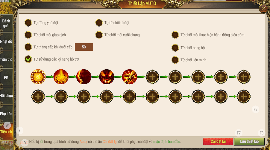 Mục kỹ năng có thể cài đặt các kỹ năng hỗ trợ buff và sử dụng theo thứ tự trước sau.